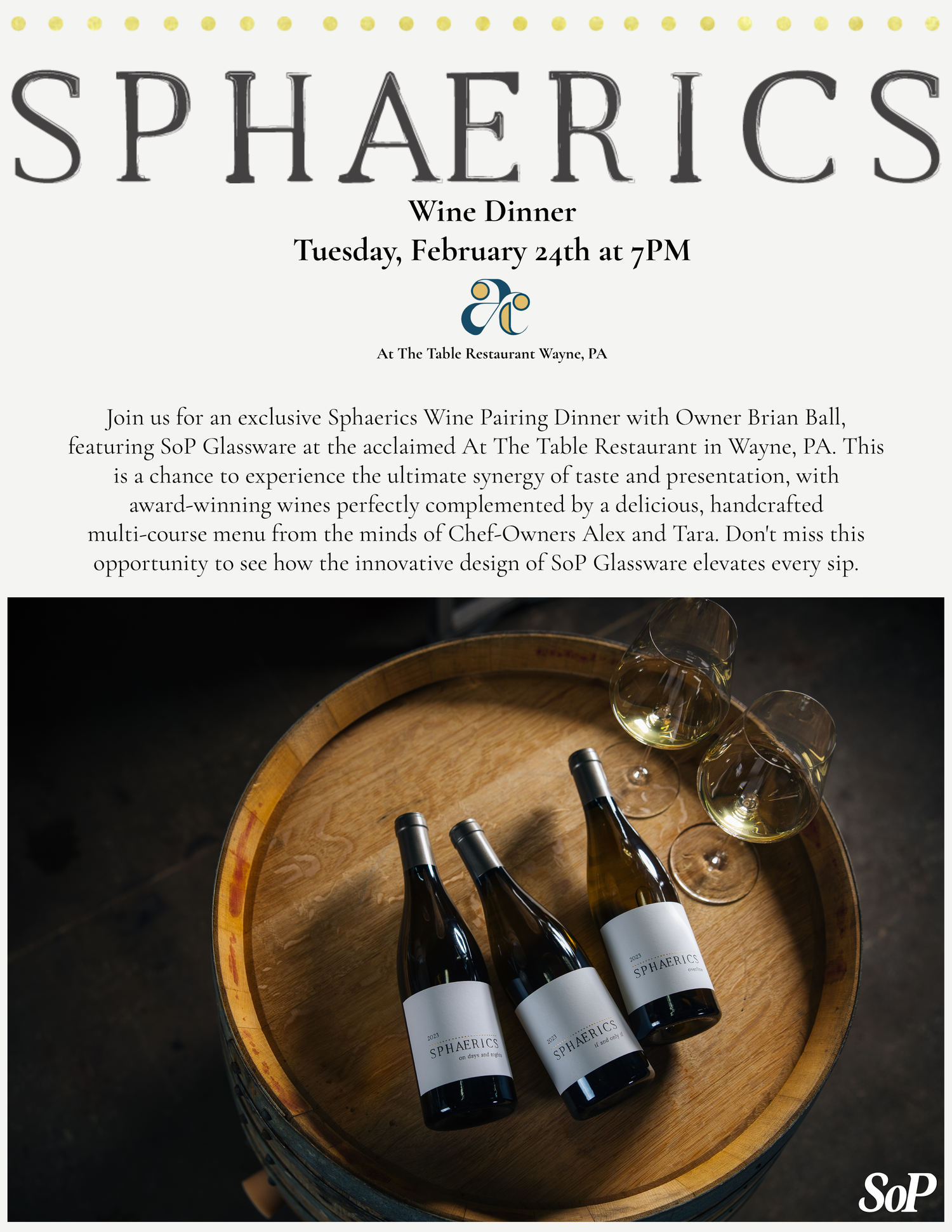 We are pleased to announce our collaboration with Vice Versa Wines and At The Table to provide an exclusive wine pairing dinner featuring our stemware! In typical ATT fashion, there will be a hand crafted multi-course tasting menu. You will have the chance to compare SoP glassware to standard glassware. We will offer a "Cocktail Hour" starting at 6:30pm before dinner which shall begin at 7:00pm.